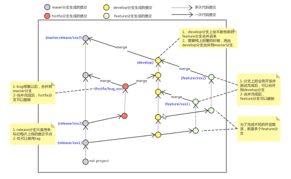 从develop创建的分支,一般是同期并行开发,但不同期上线时创建的分支,分支上的研发任务完成后合并到develop分支。