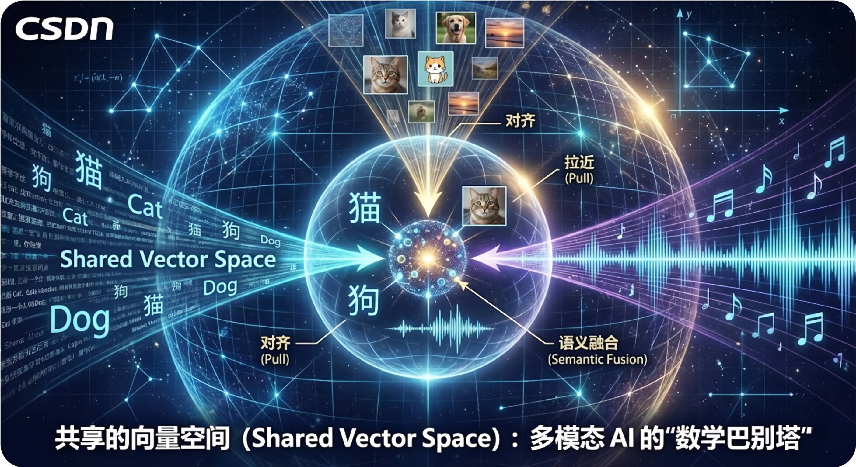 那么 共享的向量空间 就是把文字、图片、声音都扔进同一个坐标系里,并且强制要求:意思相同的东西,不管它是什么形式,坐标必须靠在一起。