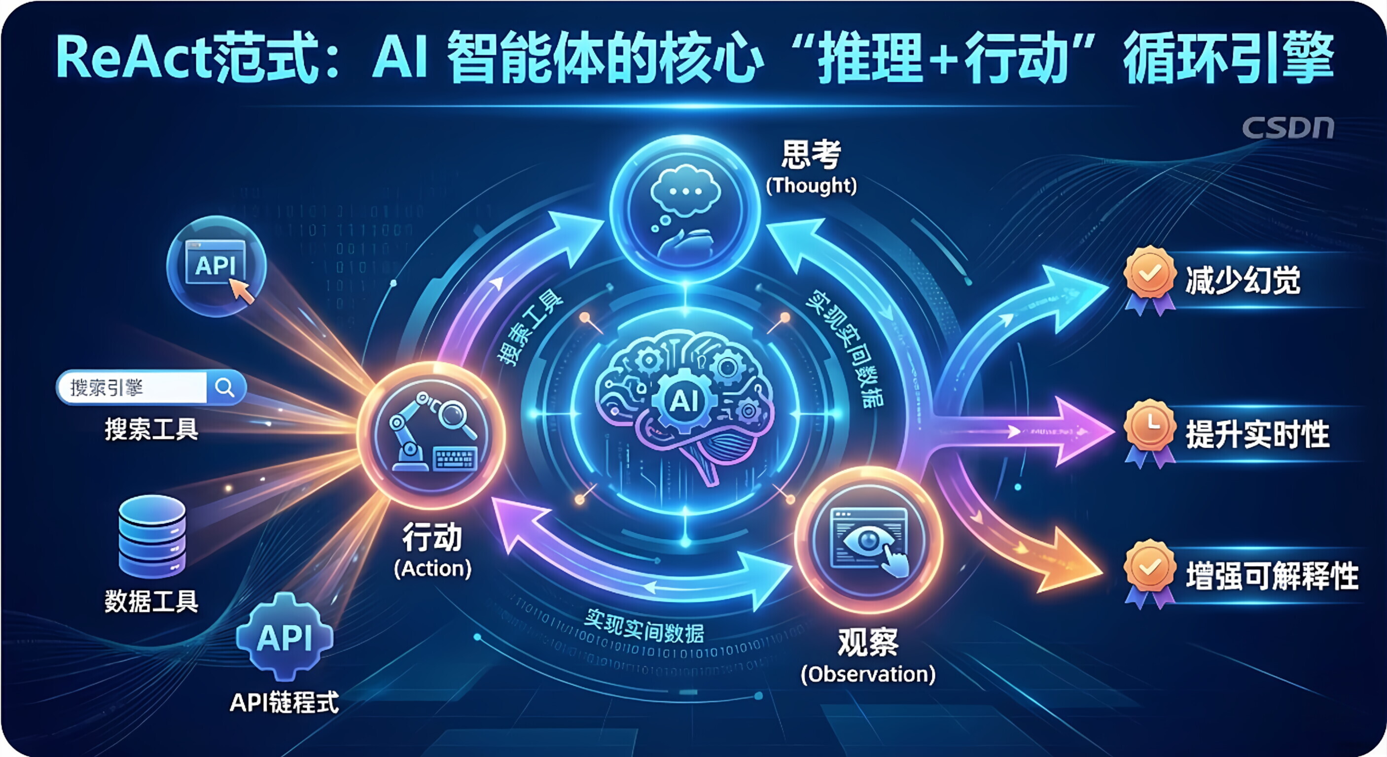 它是目前所有主流 Agent 框架(如 LangChain, AutoGPT)背后的底层逻辑。