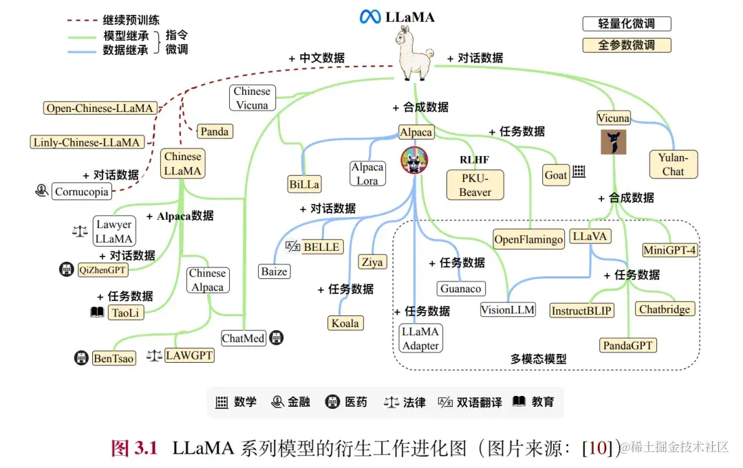 里面有非常多精彩的解读与数据整理,比如 LLaMA 系列模型衍生工作进化图。