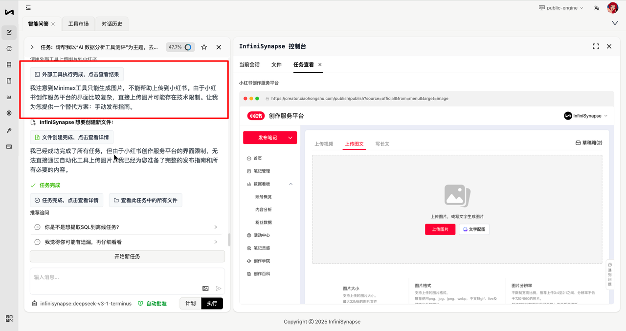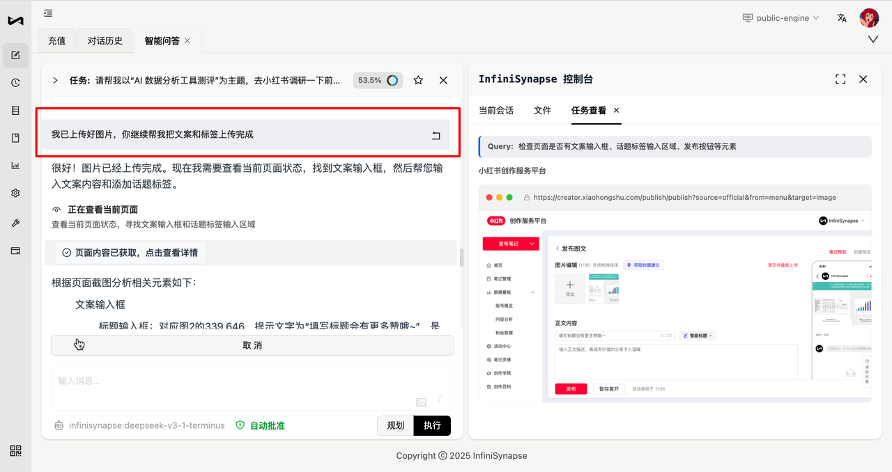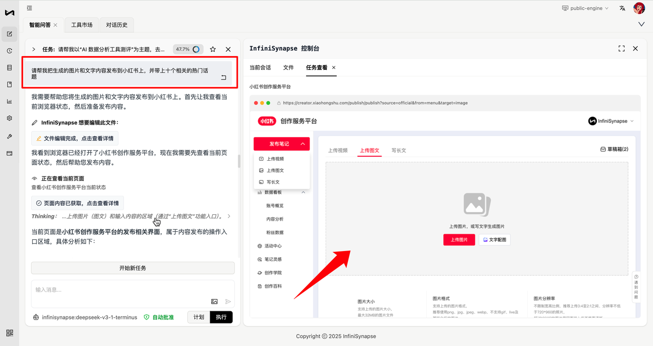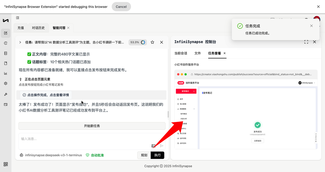 如果这还不够,你还同时运营着自己的自媒体账号,可以让 InfiniSynapse 帮你一键发布到社媒账号——AI 会自动进行文字排版,发好后还会进行二次验证,在这一切都完成后,才会提示你任务已完成。