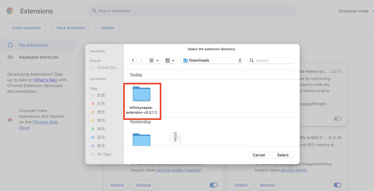 在浏览器输入: chrome://extensions/ ,接着点击右上角【开发者模式】,然后就会出现左上【load unpacked】按钮,此时会弹出目录选择框,选择下载目录里的 InfiniSynapse-exension-v0.3.1: