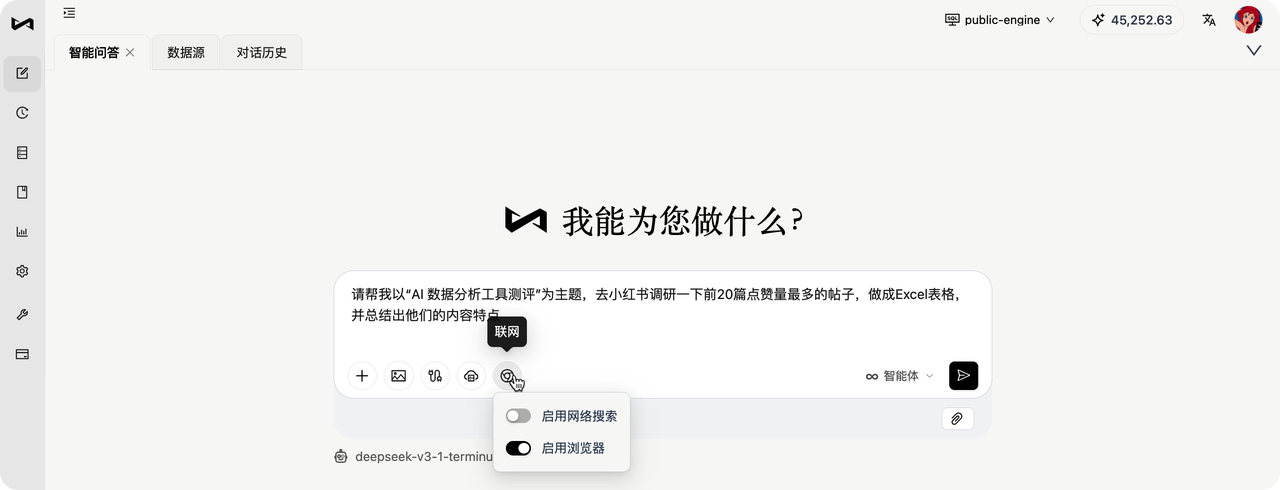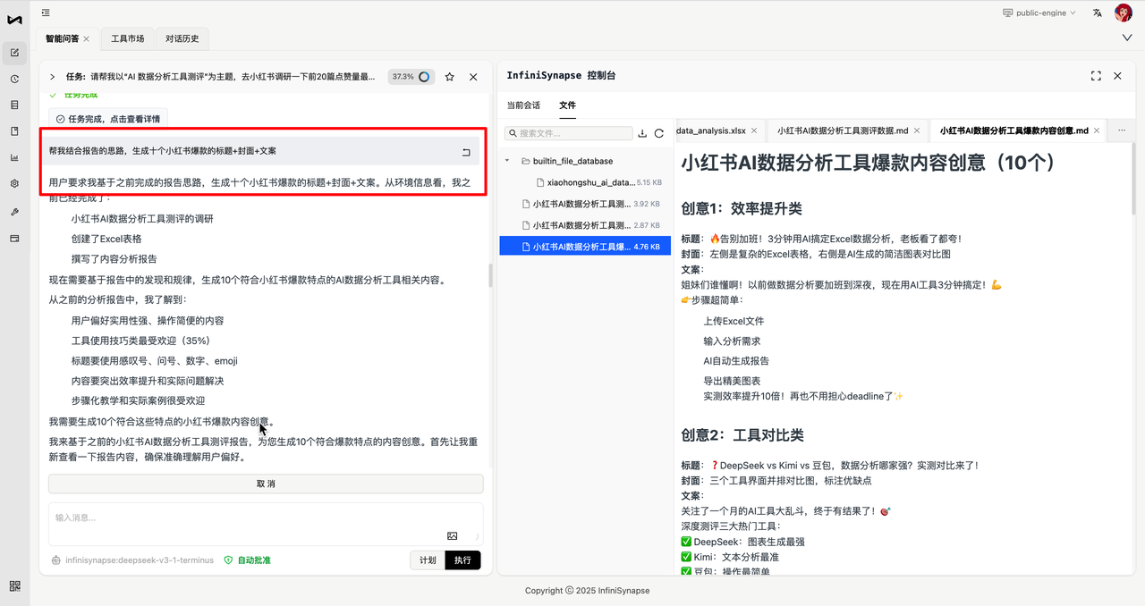 如果你是一位自媒体博主,是不是常常为了找选题、分析爆款、制作内容而头疼?假设你已经想好选题“AI 数据分析工具测评”,但你毫无头绪时,可以让 InfiniSynapse 帮你打头阵: