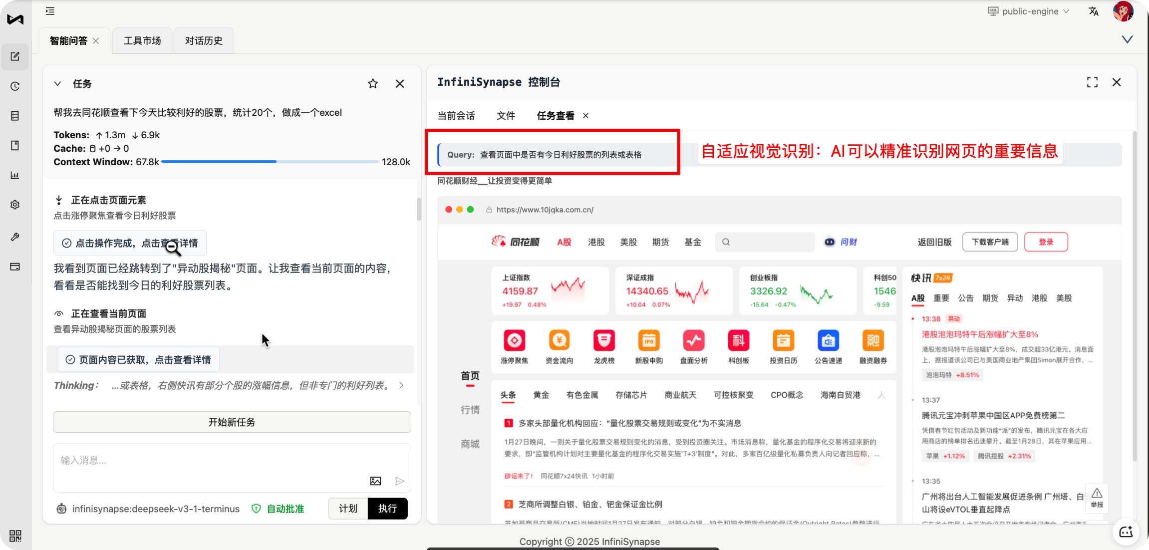 今天,我们终于在 InfiniSynapse SaaS 版中添加了 Browser Use 的原生支持,并且在 DeepSeek V3 模型中获得了 Sota 效果,节约 10 倍以上成本,让 Browser Use 的实用性越来越高,已经完全可以被用的起,用的好。