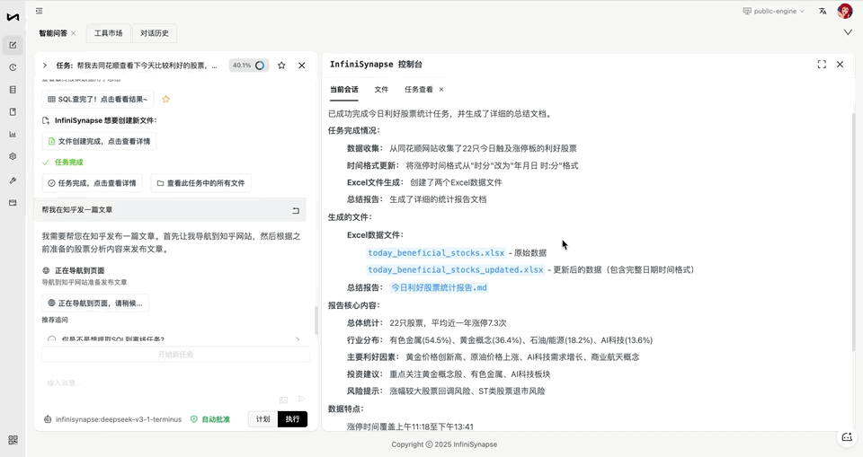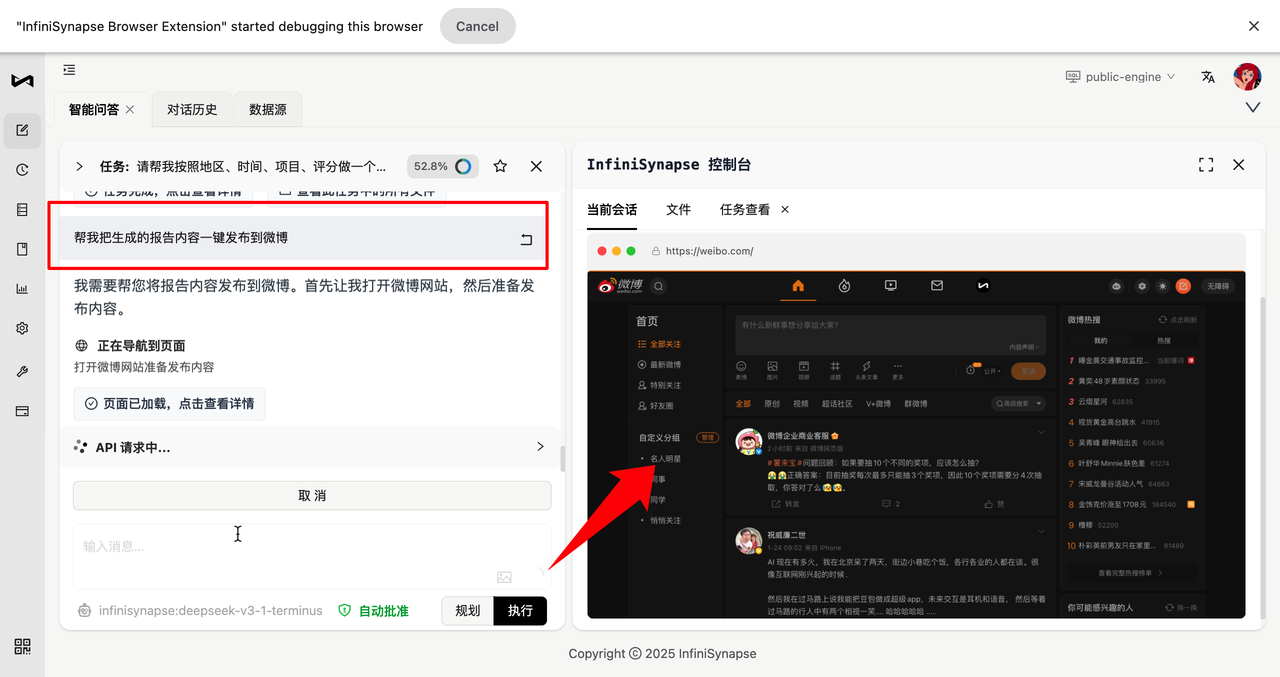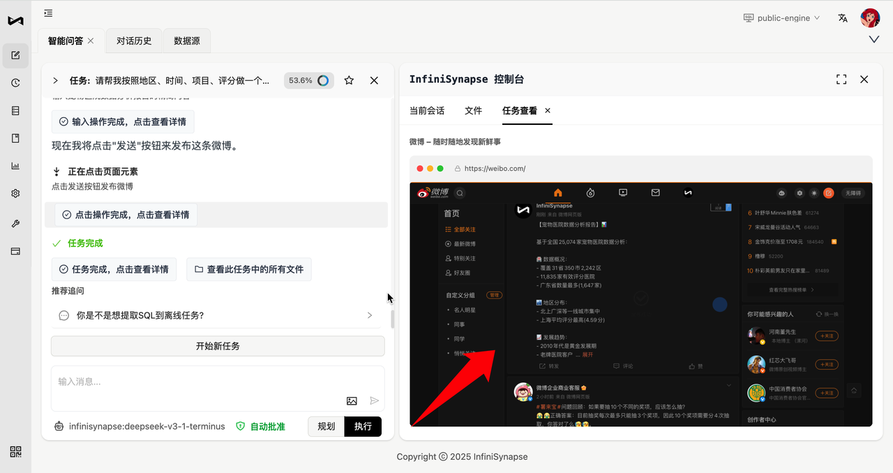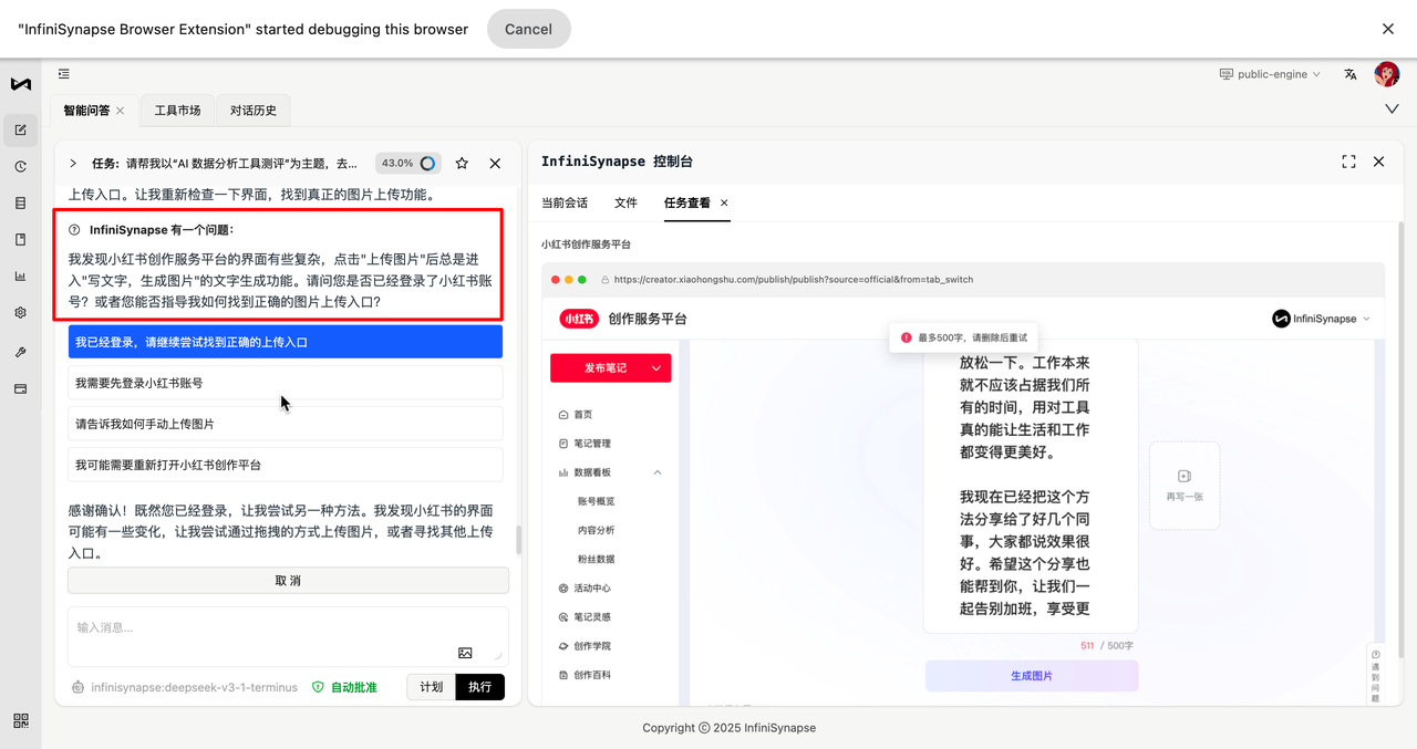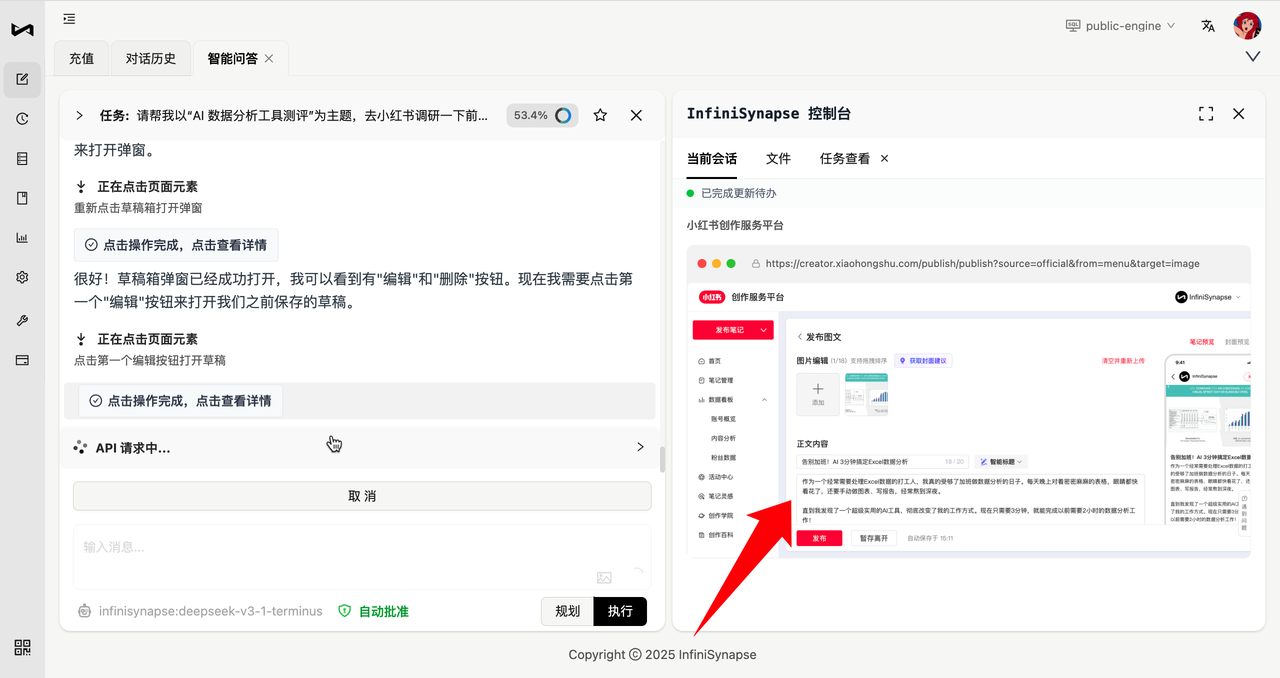 经过上述案例实测 InfinSynapse 还可以顺畅的在小红书,知乎、微博等社媒展现精准收集信息、处理信息、并一键发布的能力。