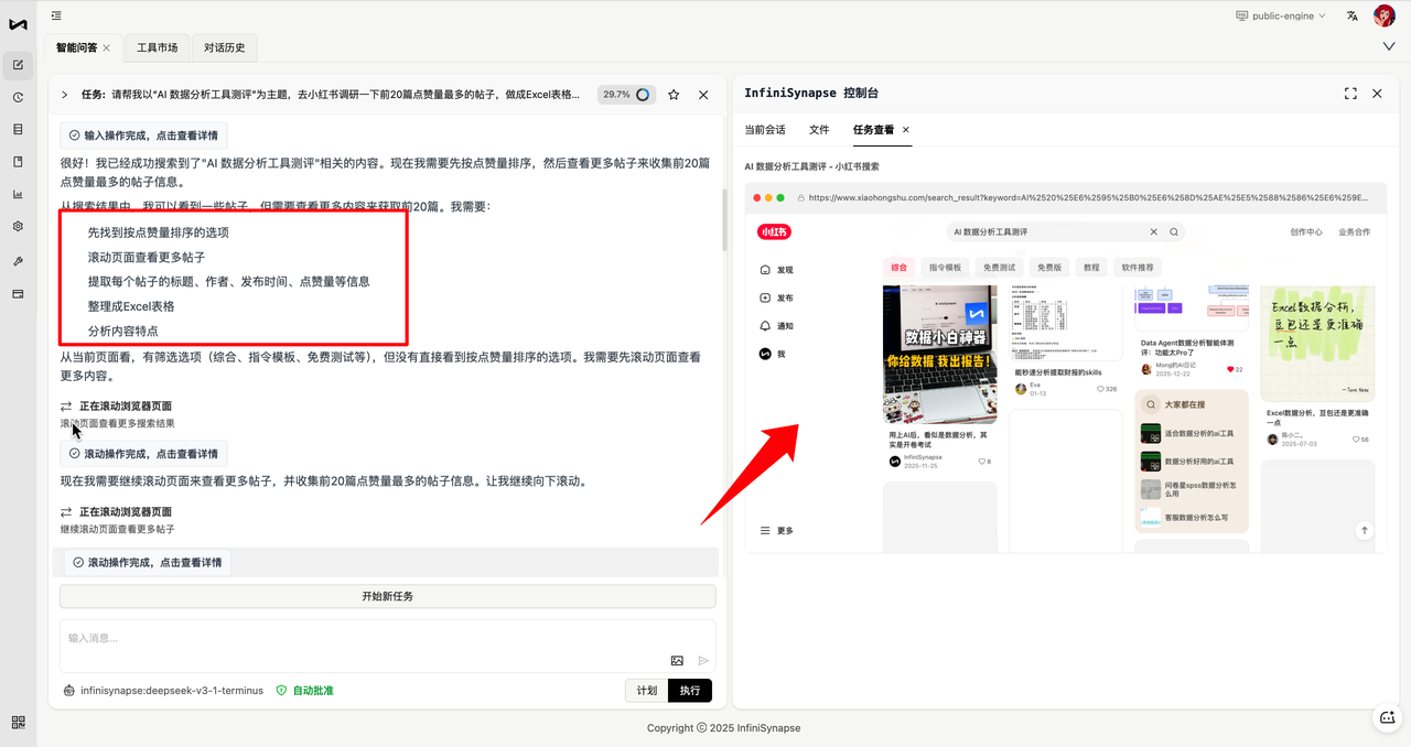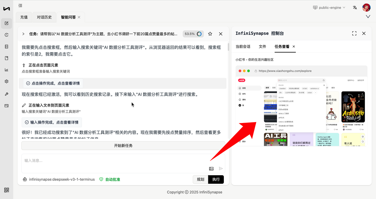 接着就可以正式开始工作。我们先感受感受下已经登过的小红书的使用,InfiniSynapse 可以实现快速访问和并且执行搜索相关动作了!