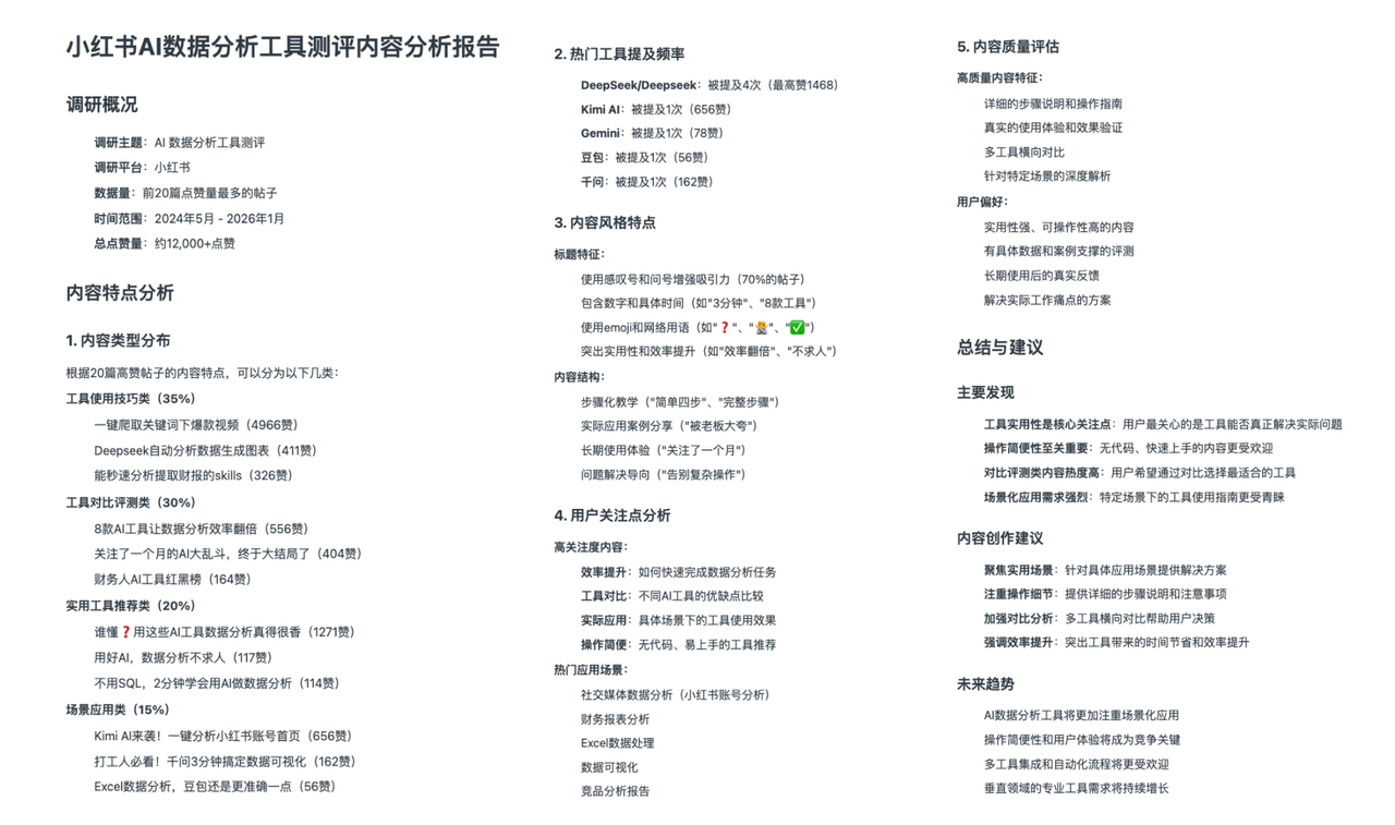 “请帮我以“AI 数据分析工具测评”为主题,去小红书调研一下前 20 篇点赞量最多的帖子,做成 Excel 表格,并总结出他们的内容特点”