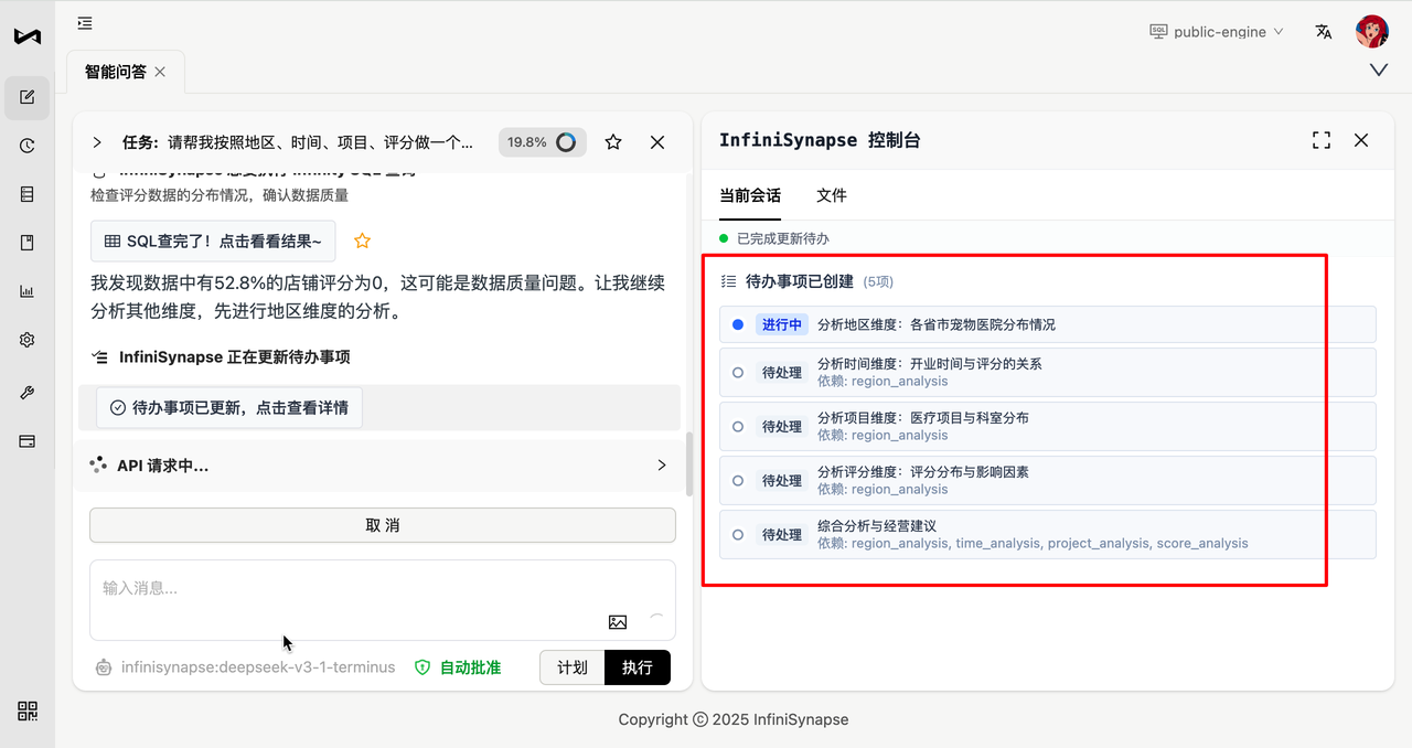 你可以在【待办事项】里发现:InfiniSynapse 会完全按照你的指令进行数据抓取和分析,逻辑非常清晰。