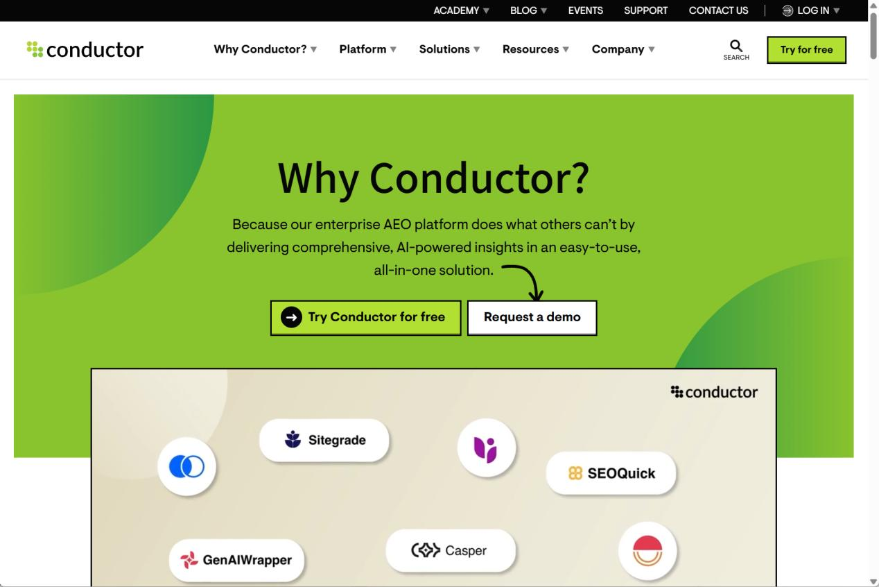 Conductor更像把“AI可见性”嵌进成熟内容体系的工具:跟踪品牌与主题在多个回答引擎中的呈现,并把洞察连接到内容生产与优化流程。它适合有内容团队、流程较成熟、但跨部门协作成本高的企业。它解决的是“看见问题却改不动”的组织摩擦,让这件事从一次性项目变成持续运营。