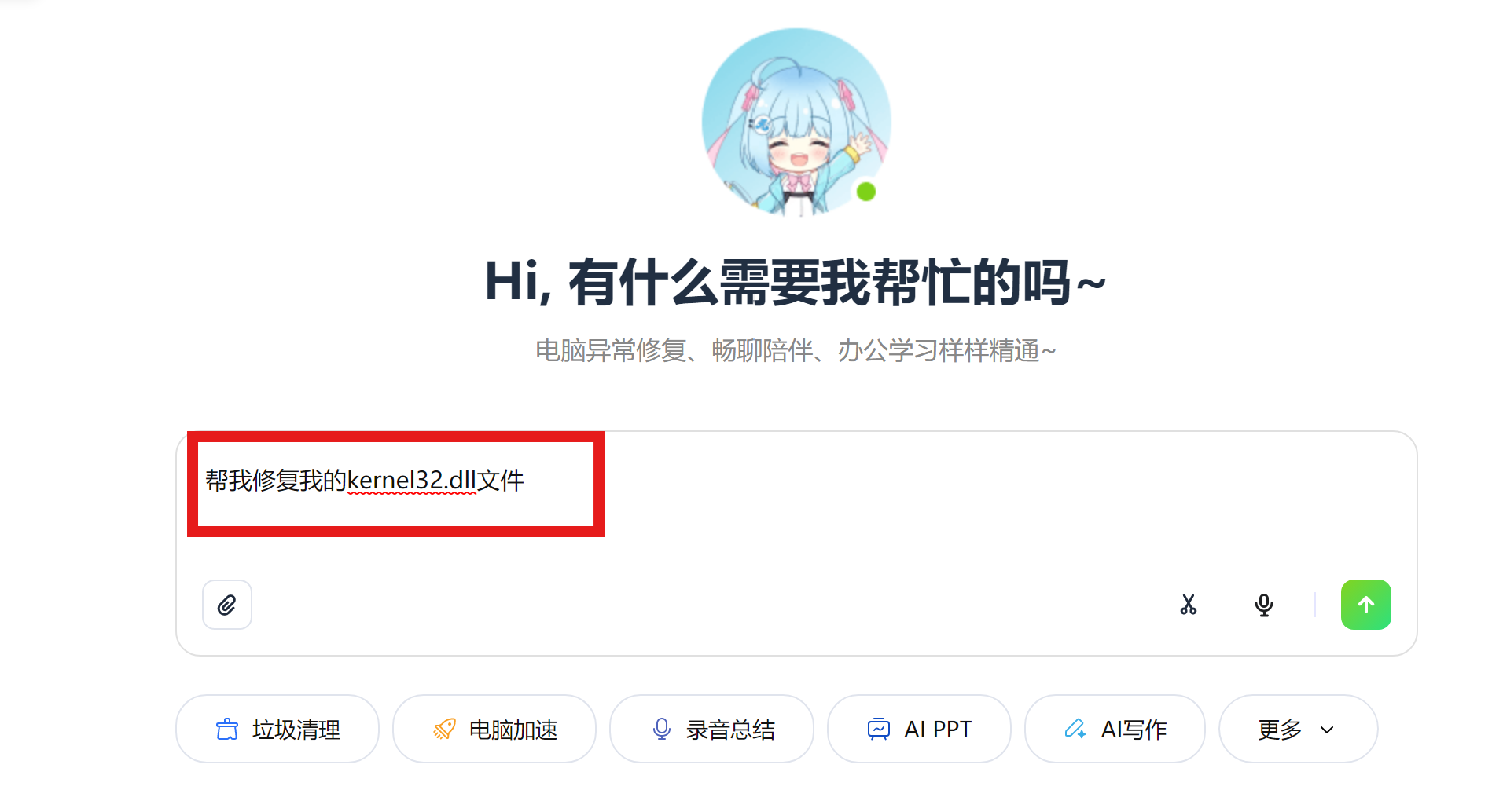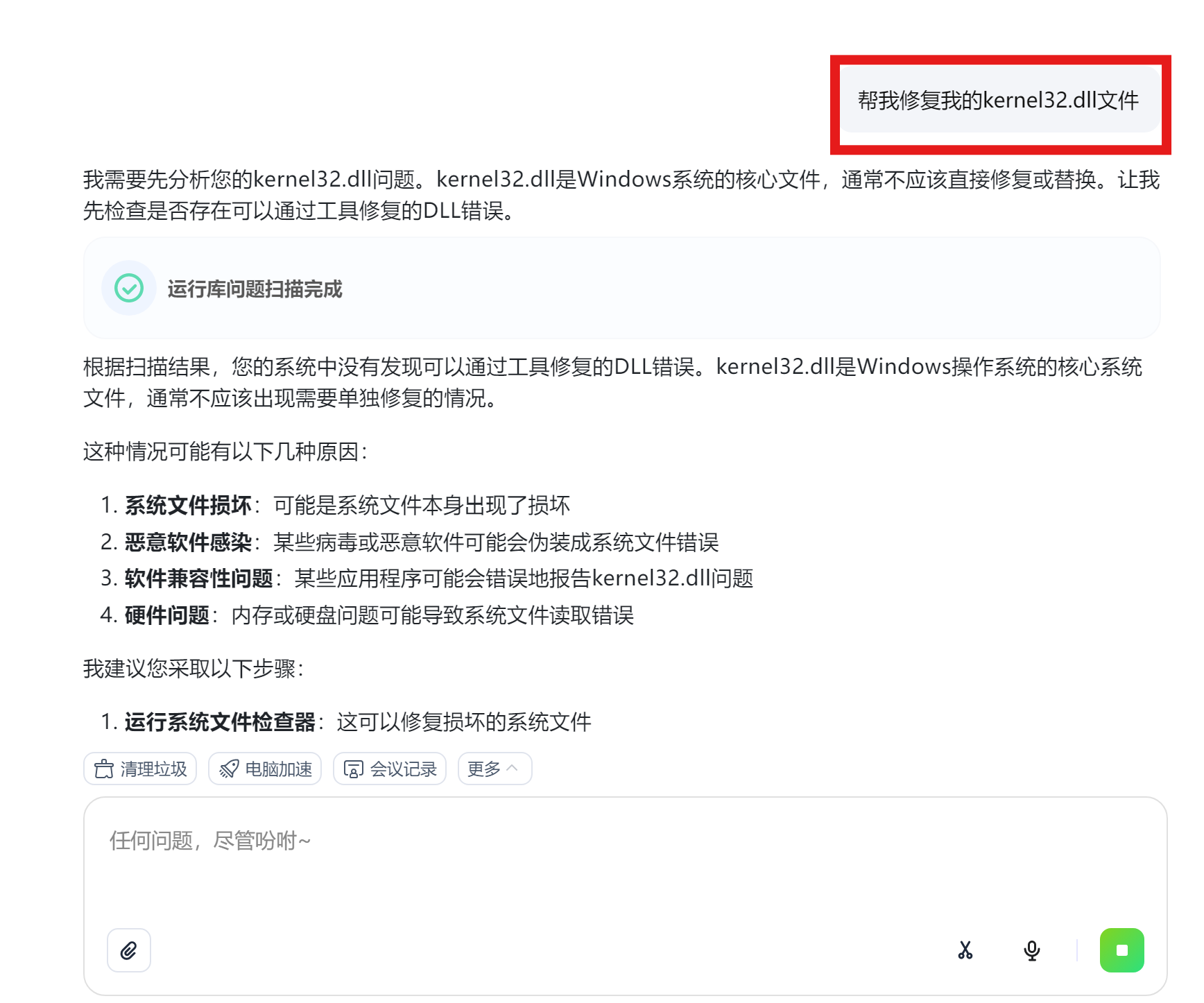 一句话指令:"请你帮我修复我的kernel32.dll文件"