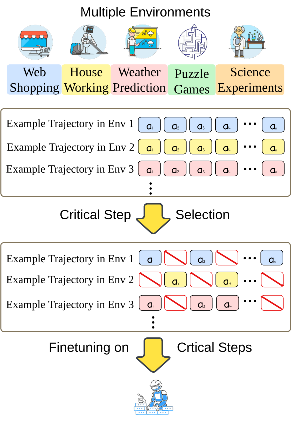 以提高大语言模型(LLM)Agent 的效率和泛化能力。ATLAS通过聚焦关键步骤,减少过拟合风险,提升不同环境和任务中的泛化性。实验表明,ATLAS选择的关键步骤微调的LLM在性能上优于全步骤微调的LLM及最新的开源LLM代理。