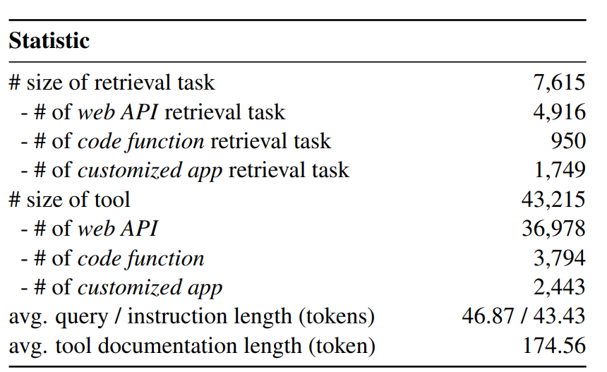 2025年,山大提出了TOOLRET,一个包含7.6k多样化检索任务和43k工具的异构工具检索基准,旨在评估大型语言模型(LLMs)在工具检索任务中的表现。此外本文作者还贡献了一个超过200k实例的大规模训练数据集,显著优化了IR模型的工具检索能力;