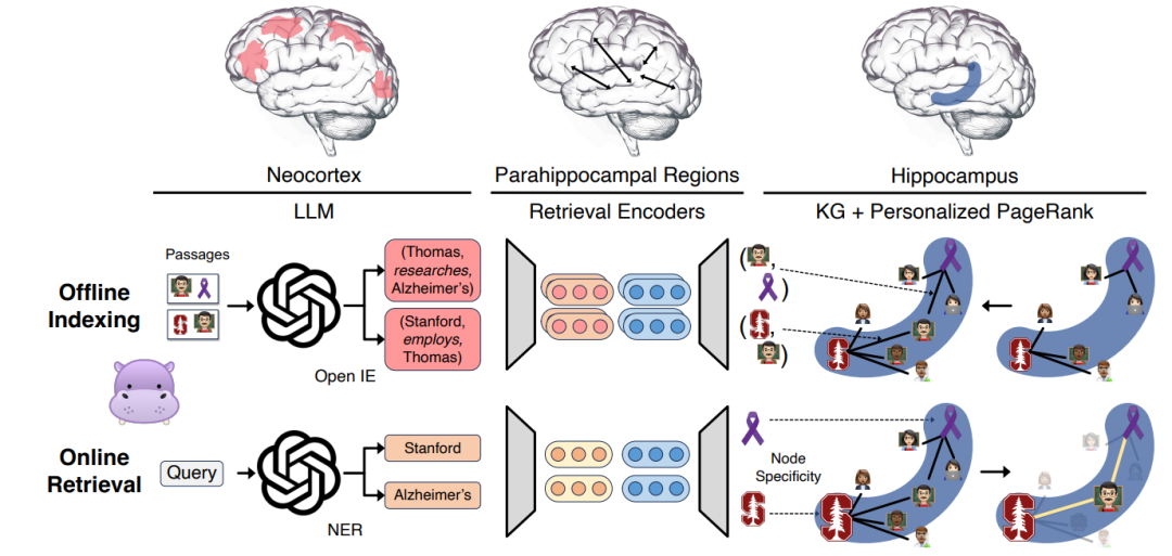 2024年,记忆力压缩方面,斯坦福设计了一个名为HippoRAG的新型检索增强模型。装备了这一"类脑"记忆系统的大模型在多种需要知识整合的任务中展现出了惊人的性能提升。HippoRAG的诞生,为大模型赋予"类脑"的知识整合和长期记忆能力开辟了一条全新的路径。