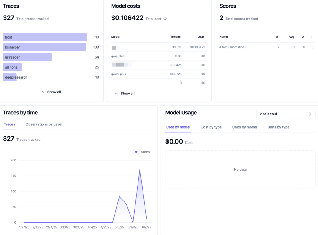 - 数据看板:通过Dashboard,可以实时查看LLM应用的质量、成本、延迟等多维度指标,全面监控和分析智能体系统的运行状态。