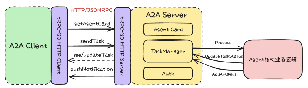 func NewA2AServer(agent *Agent) (*server.A2AServer, error) {var err error agentCard := getAgentCard() // 按照A2A协议标准生成AgentCard,描述Agent能力 redisCli, err := tgoredis.New("trpc.redis.deepresearch")if err != nil { returnnil, fmt.Errorf("failed to create redis client: %w", err) }// 创建基于Redis的任务管理器 taskManager, err := redistaskmanager.NewRedisTaskManager(redisCli, agent)if err != nil { returnnil, fmt.Errorf("failed to create task manager: %w", err) } srv, err := server.NewA2AServer(agentCard, taskManager)if err != nil { returnnil, fmt.Errorf("failed to create A2A server: %w", err) }return srv, nil}