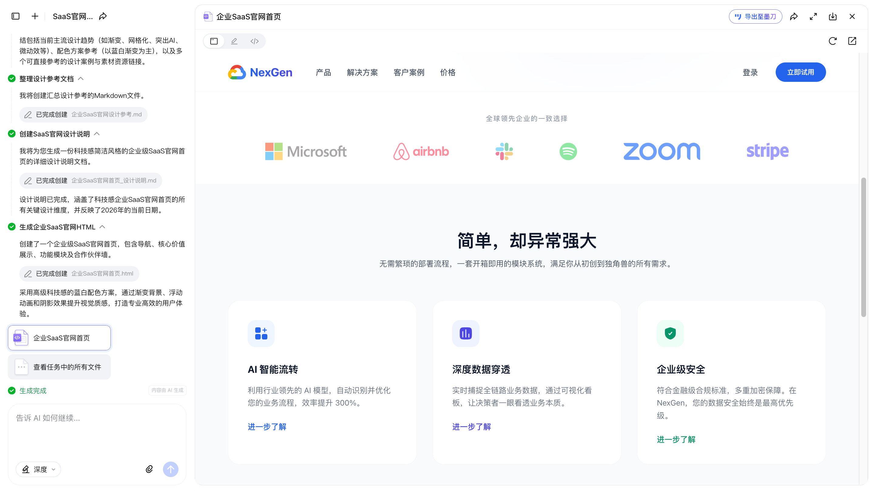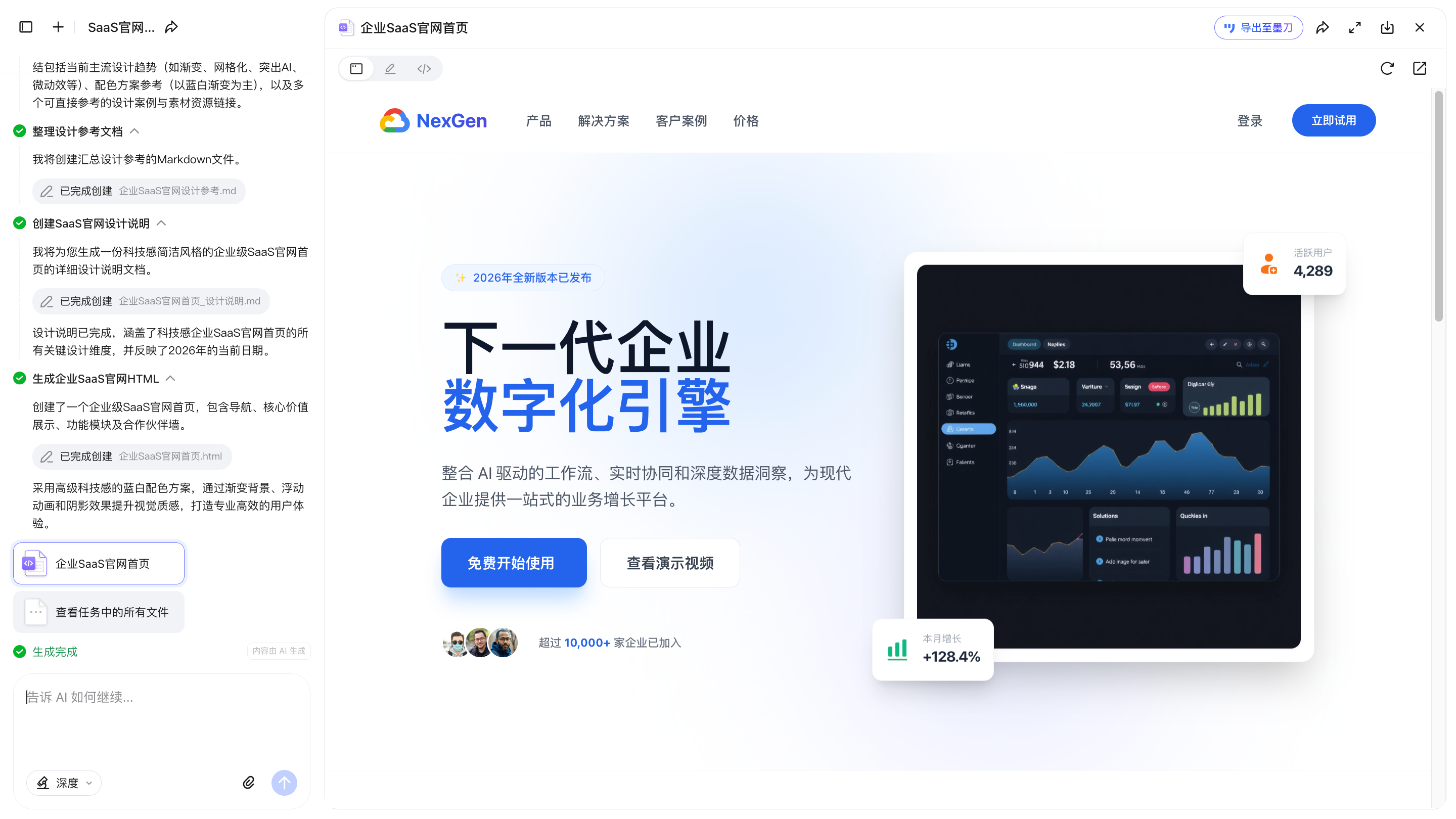 - 逻辑性:Hero区的文案它没有乱填Lorem Ipsum,而是根据“数字化引擎”自己编了一段还算通顺的副标题。
