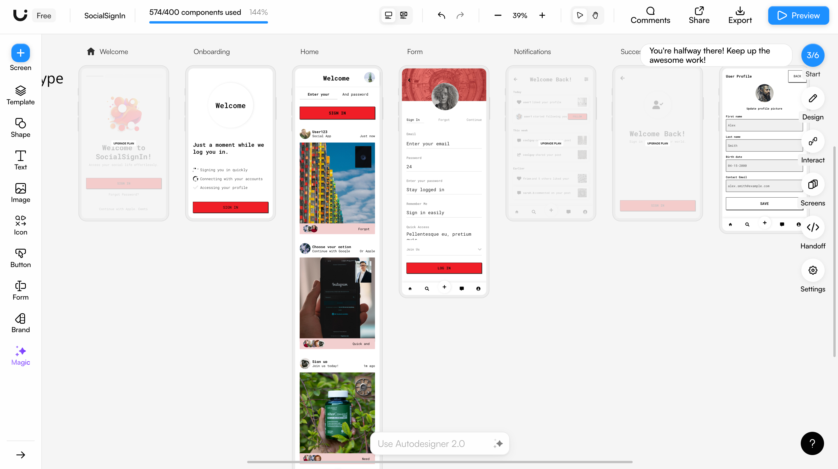 Uizard AI更适合头脑风暴,开会的时候,大家嘴里说着“要个大概这种感觉”,你那边噼里啪啦一敲,方案就出来了。它强在速度和移动端交互流的自动补全。不过很难二次编辑,操作起来没有其他工具那么顺手,如果用它生成复杂的产品结构,会明显感觉吃力。