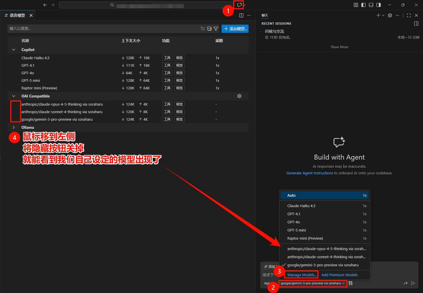 - 选择 OAI Compatible 将左侧的隐藏眼睛关闭,这样我们自己设定的模型就会出现在选择框了。