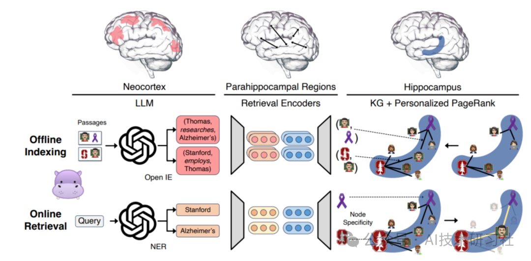 2024年,记忆力压缩方面,斯坦福设计了一个名为HippoRAG的新型检索增强模型。装备了这一"类脑"记忆系统的大模型在多种需要知识整合的任务中展现出了惊人的性能提升。HippoRAG的诞生,为大模型赋予"类脑"的知识整合和长期记忆能力开辟了一条全新的路径。