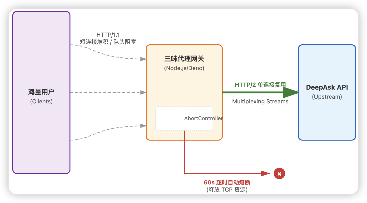 HTTP/2 的降维打击:现代 API 服务端(如 DeepAsk、OpenAI)早已全面支持 HTTP/2。HTTP/2 的核心优势是 多路复用(Multiplexing),即在一个 TCP 连接上并行传输成百上千个请求流。