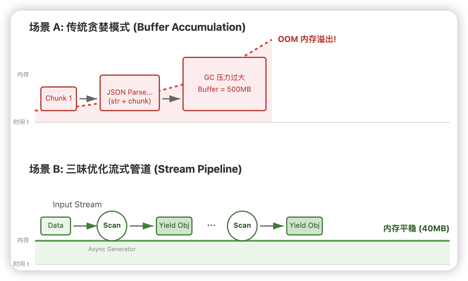 在 V4 重构版中,我们引入了 TypeScript 的 Async Generator(异步生成器)。通过维护一个极小的滑动窗口,我们实现了“零拷贝”级别的解析。
