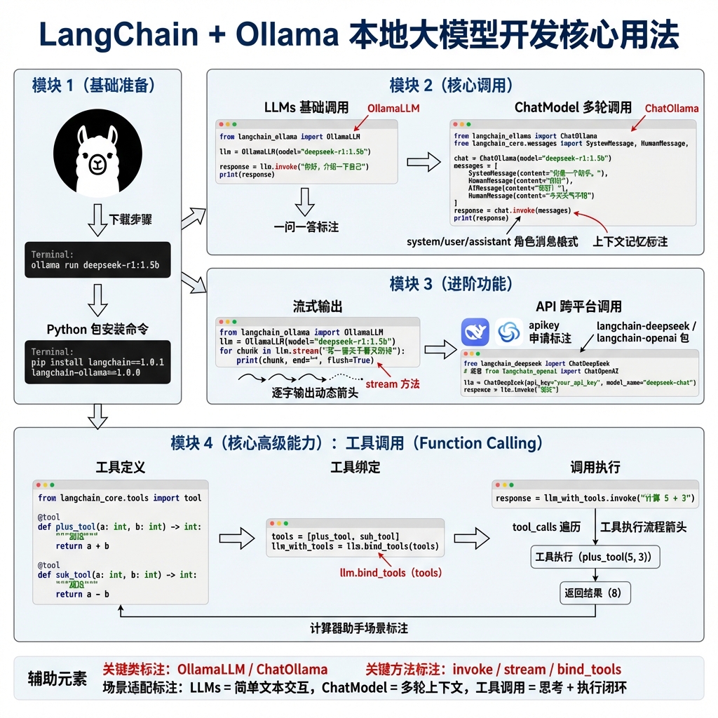 本文介绍了本地和云端大模型的调用方法及选择策略。首先详细说明了如何通过Ollama和LangChain调用DeepSeek本地模型,以及如何通过API调用DeepSeek和阿里云大模型。文章对比了基础LLMs和ChatModel的特点及适用场景,LLMs适合简单问答,ChatModel支持多轮对话。同时讲解了消息格式规范、流式输出实现方法,以及如何通过工具调用扩展大模型能力。最后演示了如何定义并绑