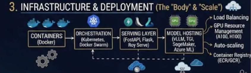 现代人工智能系统运行在容器化基础设施上。Docker 容器提供了一致性(代码在任何地方运行都相同)、隔离性(服务之间互不干扰)以及与 Kubernetes 等编排平台的兼容性。