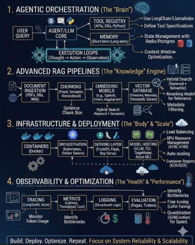 这是探讨构建企业级智能体人工智能系统综合框架的两篇系列文章的第一篇。我们将深入探讨四个协同运作的关键支柱:智能体编排(大脑)、高级 RAG 流水线(知识引擎)、基础设施和部署(身体和规模)以及可观测性和优化(健康和性能)。