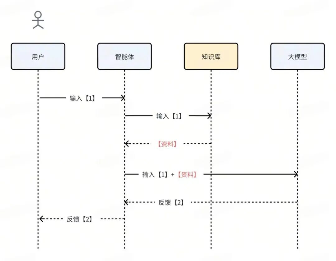 - 用户提交一个【输入】后,先使用 用户【输入】作为搜索条件,去【知识库】中搜索得到相关的【资料】。