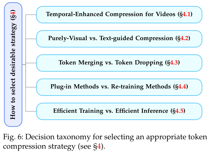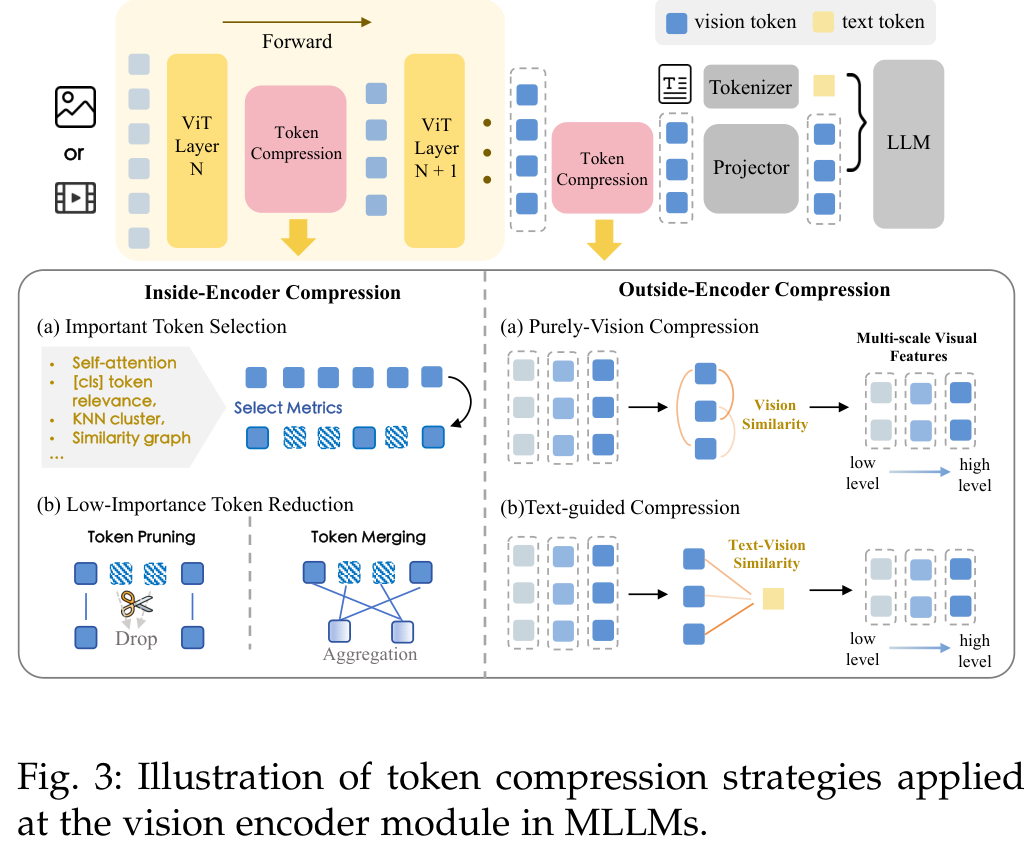 压缩操作瞄准了空间结构上的冗余(如重复的背景区域)、时间上的连续性(如视频帧间的相似性)以及模态间的对齐(如与文本无关的视觉信息)。