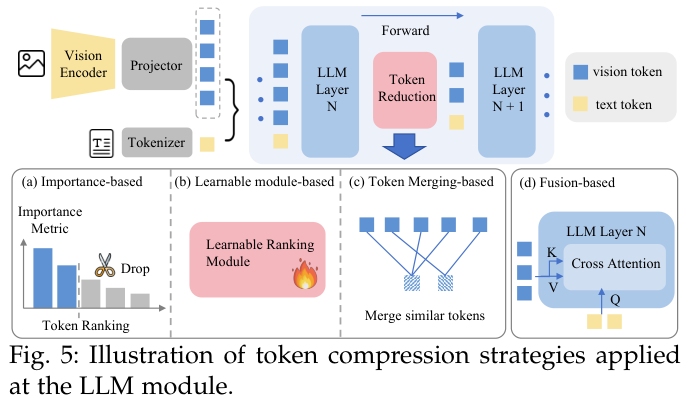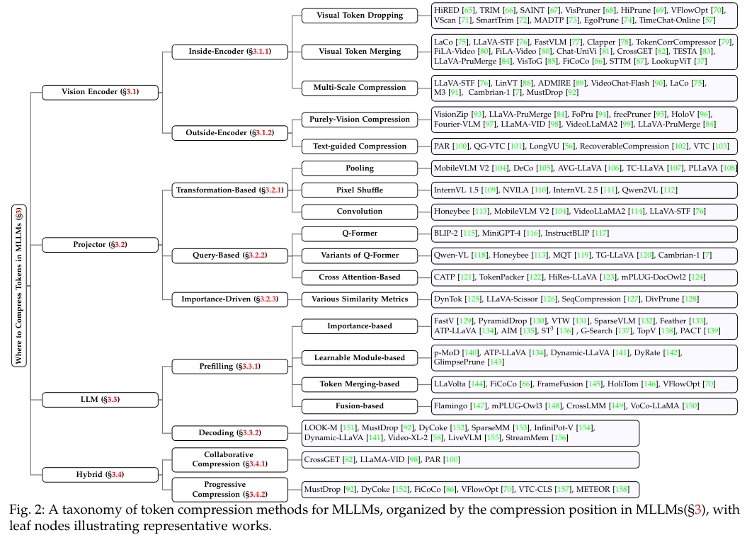 根据在模型中的应用位置,可以将现有的压缩技术系统地分为在视觉编码器、投影器以及大型语言模型这三个关键组件上的操作。
