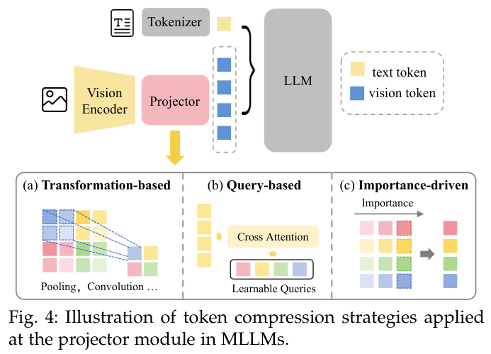 投影器的压缩策略主要分为基于变换、基于查询和基于重要性三类。