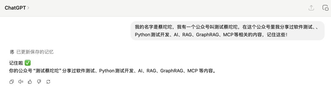 注意到这个"已更新保存的记忆",这代表ChatGPT把这段内容存入到它的记忆库里面去了!🧠