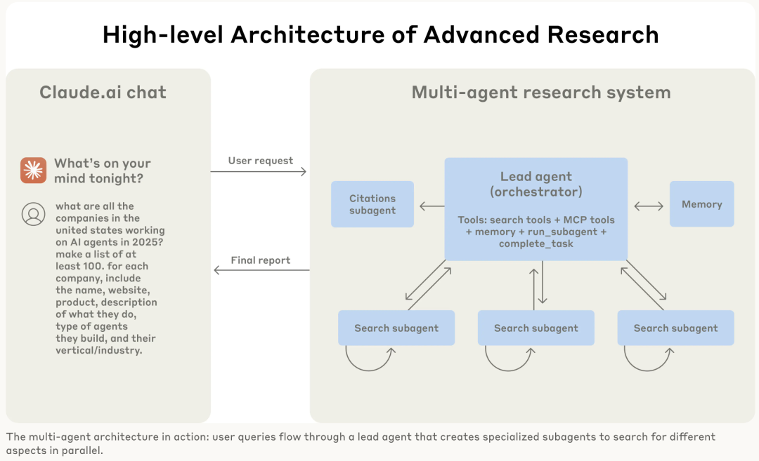 - Lead Agent分解任务 → 各个Subagent(在接收到用户请求之后,Lead Agent便会把用户的问题拆解成多个task,并下发到其他的Agent系统里,Anthropic把这些Agent称为Subagent)