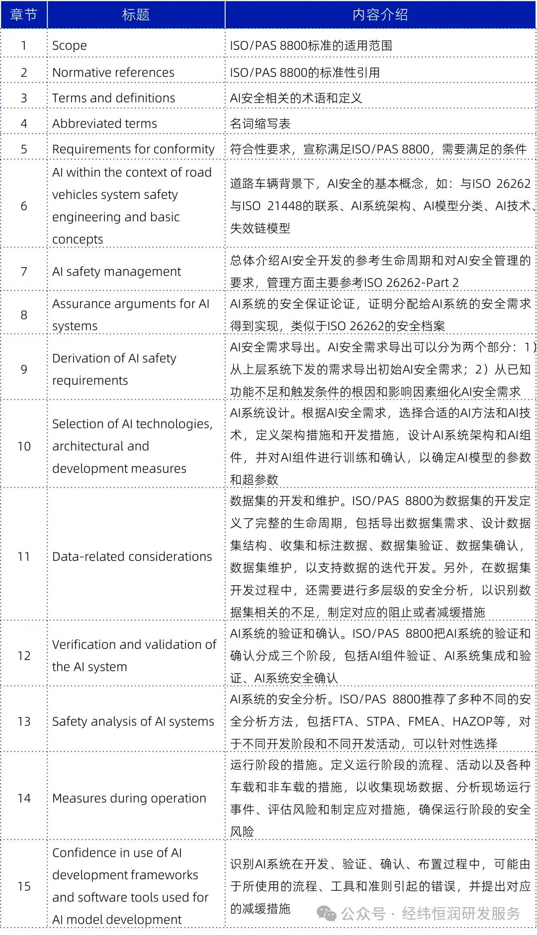 ISO/PAS 8800共包含15个章节,涵盖了人工智能安全开发的全生命周期。该标准既包含“V”模型左侧的需求导出、系统设计与实现,也涵盖“V”模型右侧的验证与确认环节。