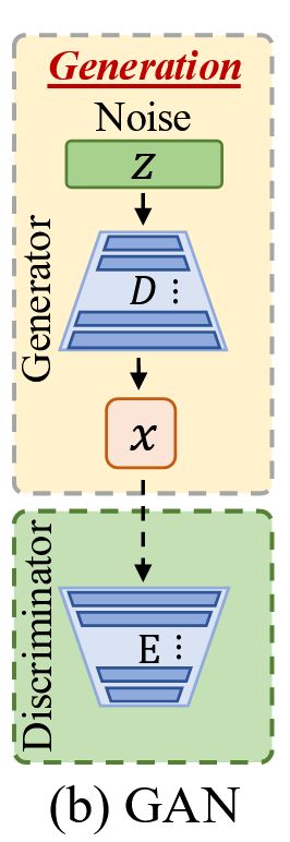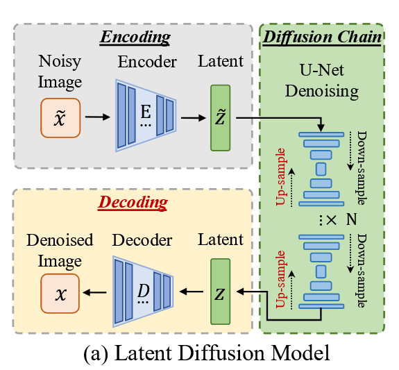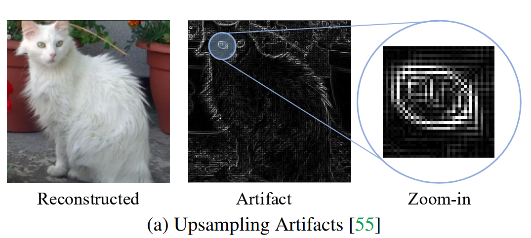 除了下采样和上采样,大多数生成模型还共享另一个共同/相似的操作——解码。图4(a-b)展示了两种流行的生成模型,即潜在扩散模型和生成对抗网络。LDM将噪声输入编码到潜在空间,通过多个扩散步骤进行处理,最后解码回像素空间。GAN采用更简单的方法,直接将噪声向量映射到输出图像。它同样使用判别器来指导生成过程。两者都有一个解码器组件D。与下采样和上采样类似,解码也会引入其自身的伪影。