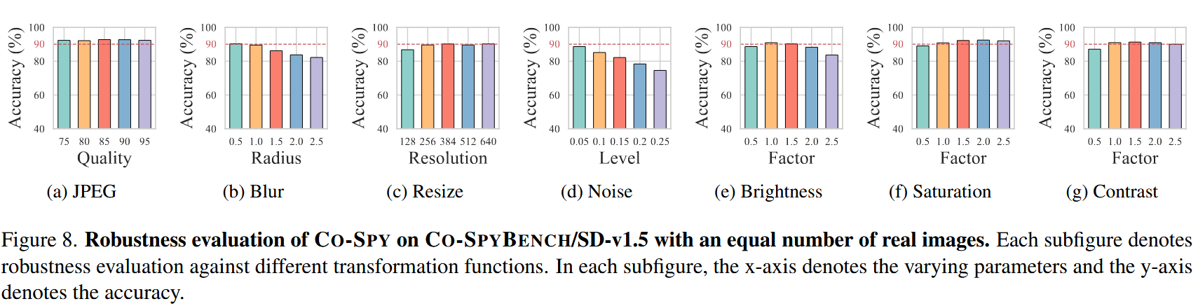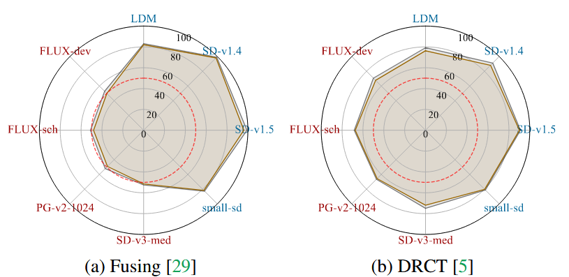 a) 提出了Co-SPyBENCH,这是一个新颖、高质量且多样化的合成图像检测基准。它包含超过一百万张图像,包括来自五个已建立数据库的真实图像,以及使用相应真实图像标题在各种配置下生成的合成图像。合成图像由22种最先进的文本到图像扩散模型生成,包括最近发布的FLUX等最新模型。为了增强多样性,Co-SPyBENCH包括使用不同标题、分辨率和配置(例如不同的扩散步骤和引导尺度)生成的合成图像。该基准在全面性和多样性方面都超过了现有数据集,为评估未来的检测方法提供了坚实的基础。此外,我们还从5个知名网站收集了合成图像,以模拟真实世界的野外测试场景。