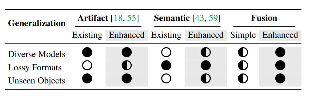 第一列(Artifacts Detectors (Existing)):展示了现有伪影检测器在三个场景下的表现。它在支持多样化模型和泛化到未见物体方面表现良好,但在支持有损格式方面能力很弱。