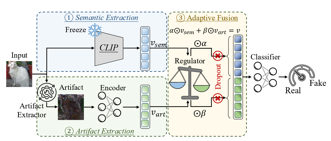 进行自适应融合。其中R_sem和R_art分别是语义和伪影特征的调节器。系数α和β对各自的特征进行缩放,加权后的语义和伪影特征被拼接起来得到聚合特征v。此外,我们在聚合前对特征应用随机丢弃,在训练期间随机将α或β设置为0,以防止对任一特征的过拟合。两个系数永远不会同时设置为0,以避免v成为零向量。最后,一个分类层将聚合特征v映射到一个输出分数,代表输入是合成图像的概率。