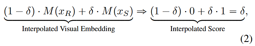 操作:在由预训练CLIP模型提取出的“图像特征向量”(即嵌入)空间中进行操作。具体是在真实图像的特征向量(x_R)和合成图像的特征向量(x_S)之间进行线性插值。