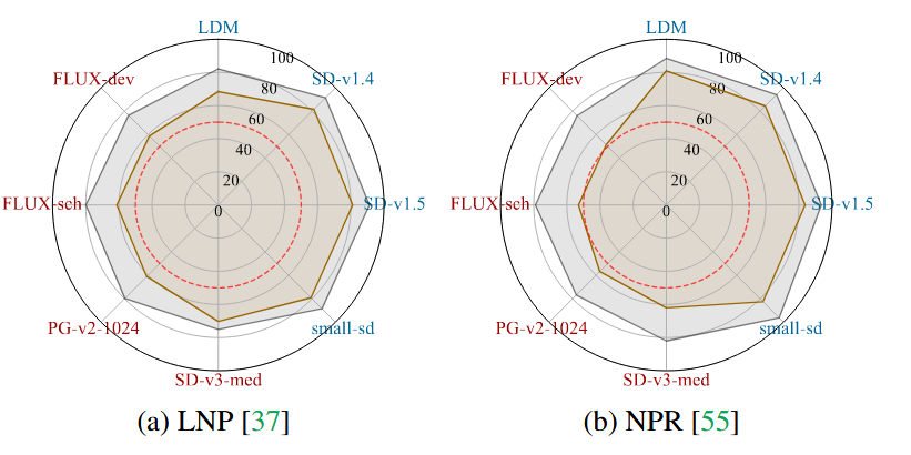 展示LNP和NPR的性能。图中,蓝色模型代表较旧的、生成图像与合成训练样本相似的模型,红色模型代表最近的、能生成更多样化和独特图像的模型。灰色图线表示未应用任何变换的测试结果,棕色图线表示应用了JPEG压缩后的测试结果。该图表明,伪影检测器在所有模型上都实现了很高的泛化能力,平均准确率约为85%。然而,即使轻微的JPEG压缩也会导致其性能大幅下降约17%。这验证了伪影检测器能很好地泛化到不同的模型和未见过的物体,但对有损格式非常脆弱。