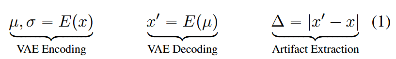 将输入图像x通过VAE编码器E编码为潜在空间的均值μ和方差σ,然后仅使用均值μ通过解码器D重建得到图像x',最后通过计算x'与x的绝对差值来提取伪影Δ。这些提取出的伪影随后被送入一个ResNet-50分类器,以区分图像是真实的还是AI生成的。