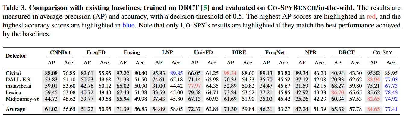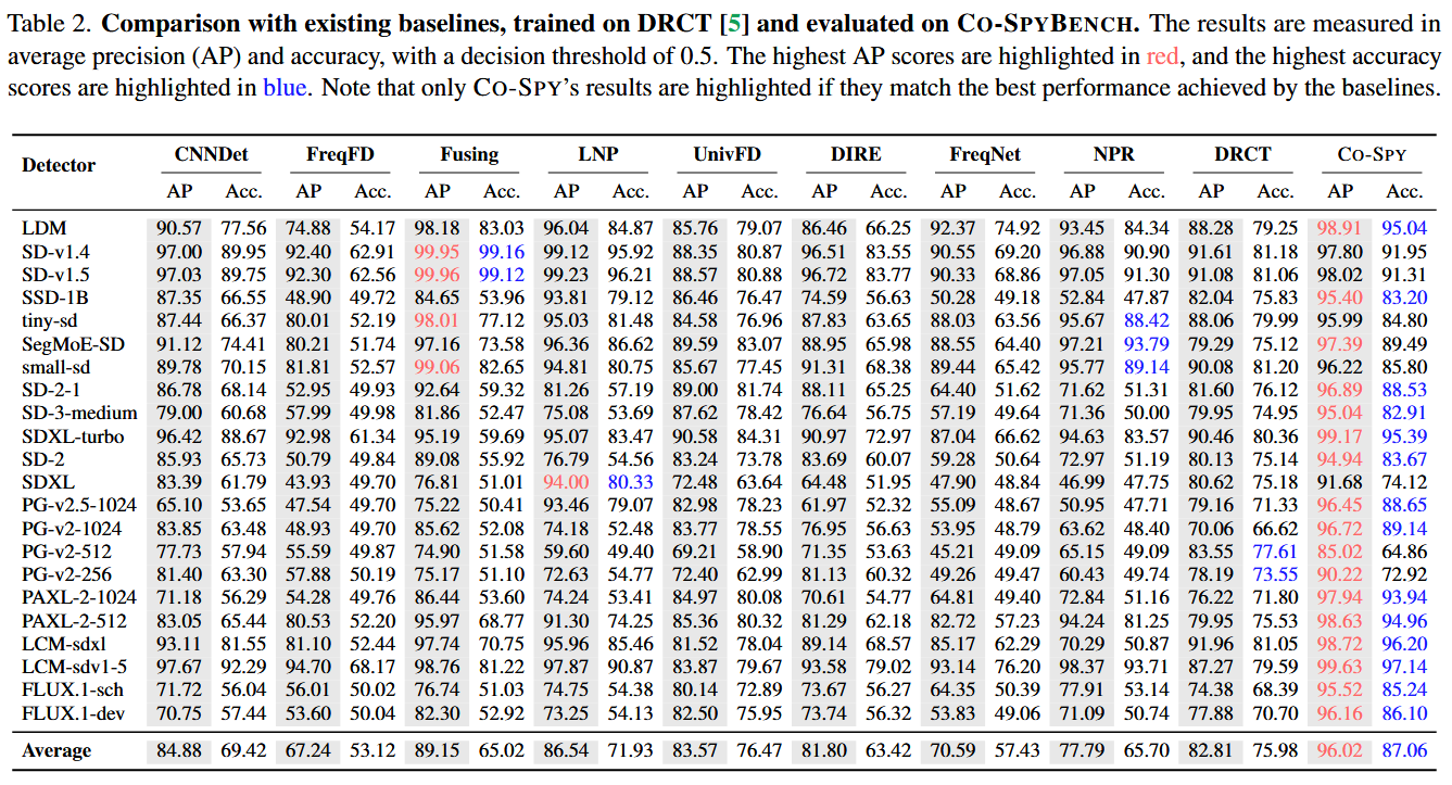 表二展示的是在Co-SPYBENCH测试集上的评估结果。该测试集由研究团队精心构建,包含了22种最先进的生成模型在多种配置下生成的合成图像,旨在全面评估检测器在多样化、受控的生成内容上的性能。