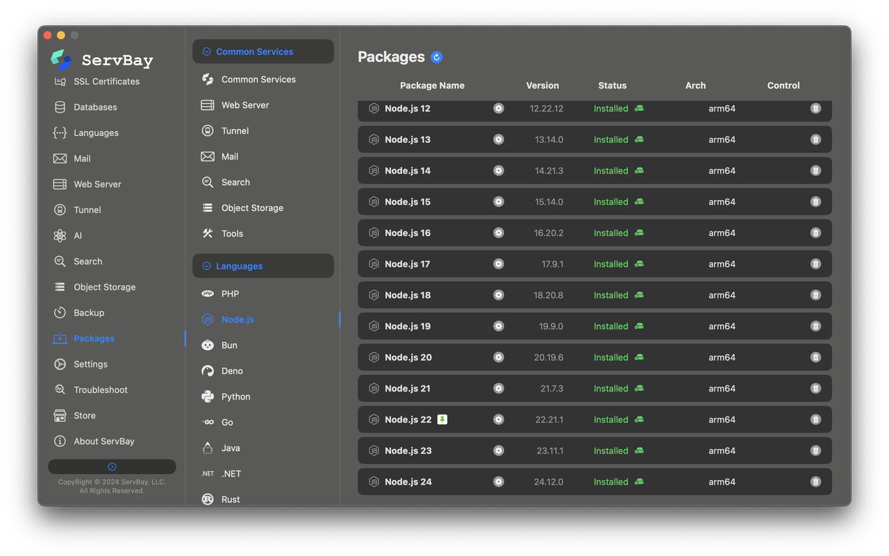 作为一款专为开发者设计的环境管理工具,ServBay 在 Node.js 的支持上做得非常细致: