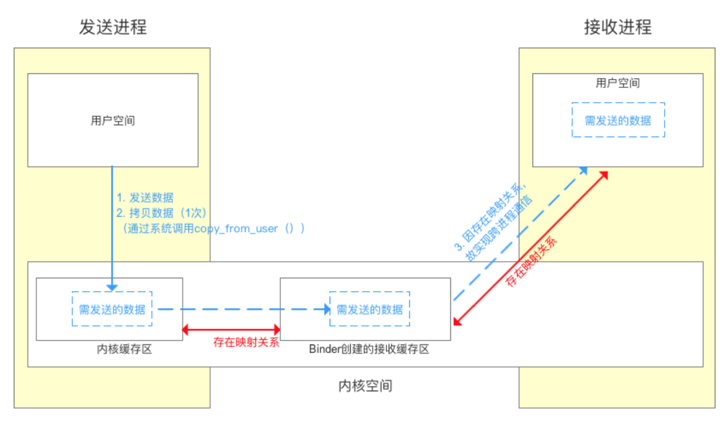 - Binder 驱动在内核态开辟一块缓冲区,并通过 mmap 将该缓冲区同时映射到发送进程和接收进程的用户态地址空间;
