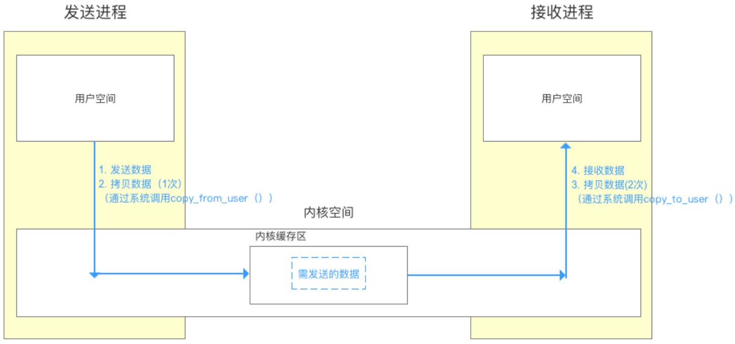 - 内核将缓冲区的数据拷贝到接收进程的用户态内存(第二次拷贝);