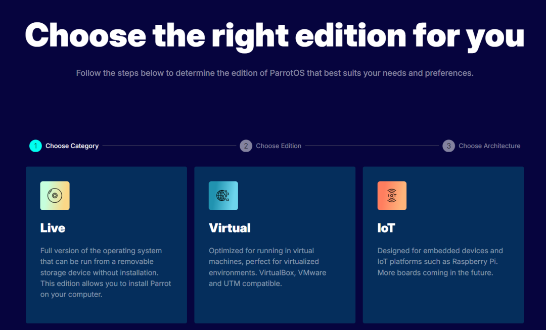 下载方式:目前,Parrot 7.0 已提供 64 位 Home 与 Security Live 版本下载,同时还提供 Docker 镜像、虚拟机镜像、树莓派镜像以及 RISC-V 版本。