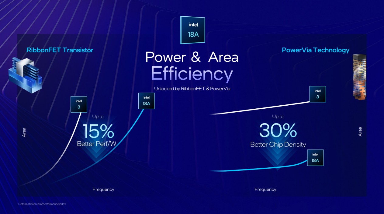 在Intel 18A工艺与上代Intel 3工艺之间,实际上英特尔跳过了Intel 20A工艺,所以本质上Intel 18A属于隔代的升级工艺,相比于Intel 3工艺,Intel 18A每W性能提升幅度达15%,芯片密度提升30%,这就为Intel 18A工艺下的Panther Lake带来了底层技术保证。Panther Lake架构的目标是同时拥有前代Lunar Lake的出众能效表现与Arrow Lake的优秀性能上限,并得益于Intel 18A工艺、PowerVia背面供电技术、RibbonFET全环绕栅极晶体管技术,在二者的基础上继续精进,成为高效能与高性能的集大成之作,为轻薄本、商务本、全能本产品提供更强的表现。