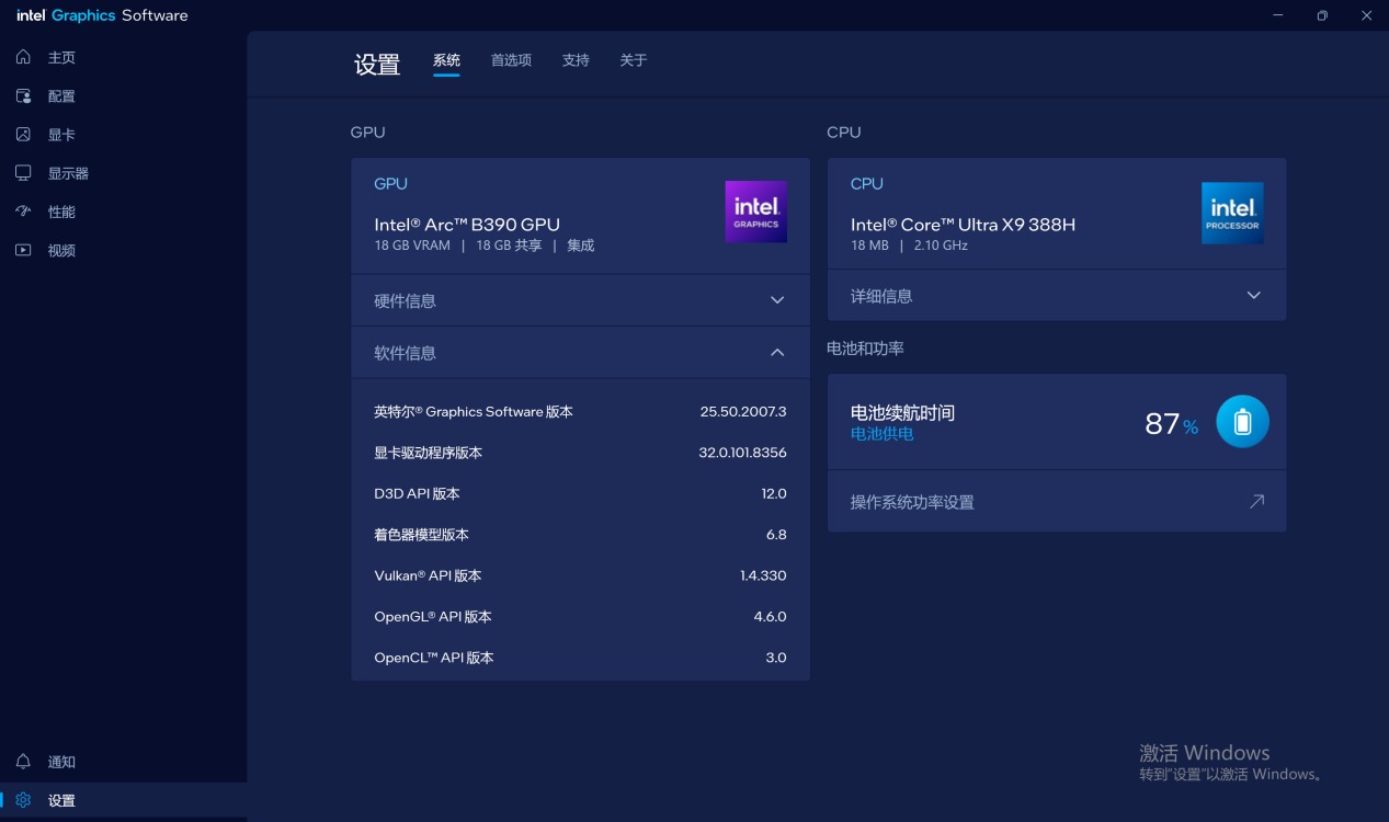 测试时显卡驱动程序版本为:32.0.101.8356,Intel Graphics Software版本25.50.2007.3。