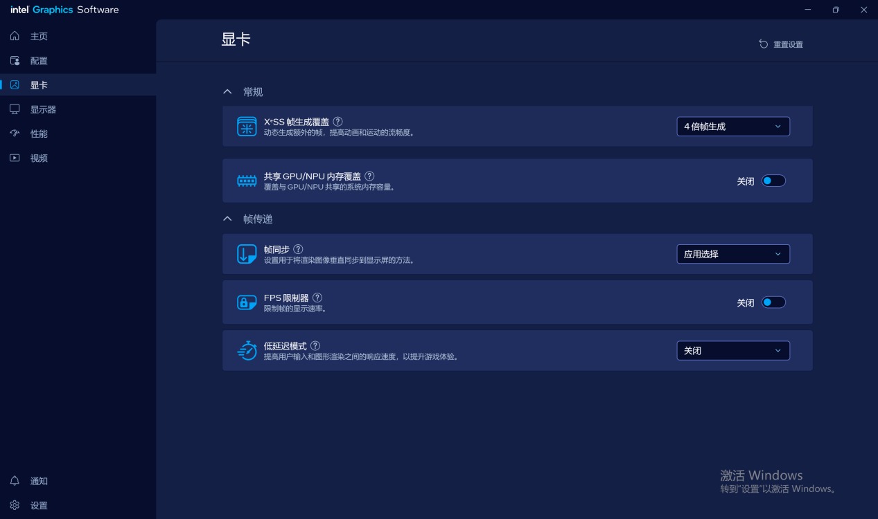 先在Intel Graphics Software的显卡选项卡中,第一列Xess帧生成覆盖这一选项选择4倍帧生成,这样我们在游戏中选择Xess帧生成后,就默认开启的是4倍帧生成了。